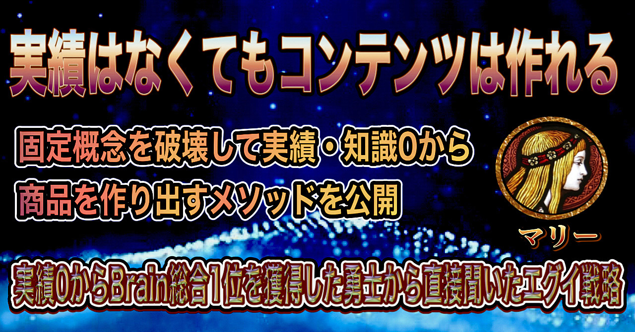 【実績はなくてもコンテンツは作れる】 固定概念を破壊して実績・知識0から商品を作り出すメソッドを公開 〜実績0からBrain総合1位を獲得した勇士か直接聞いたエグイ戦略〜