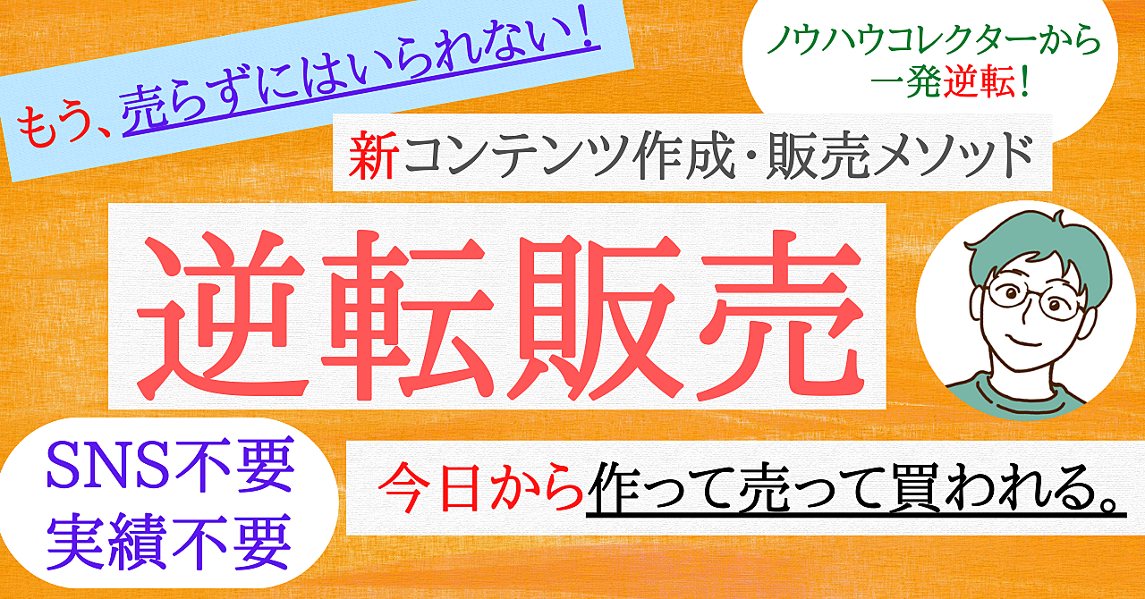 【逆転販売】 ノウハウコレクターに終止符を打ち、立場を一発逆転。 SNS不要、実績不要の新手法。 今日から作って売って買われる、新コンテンツ作成・販売メソッド。